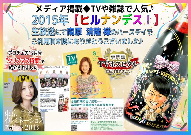 そんなマリアテラスのオリジナルシャンパンは、2015年【ヒルナンデス!】のメイン司会者でお馴染みの南原清隆氏のお誕生日プレゼントに利用された、実績のある商品です!