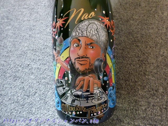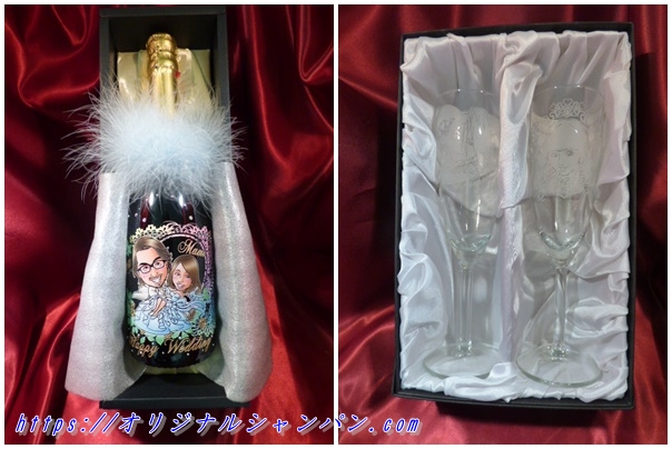 オリジナルシャンパンは、ガラス瓶上にこのように、『似顔絵』・『名前』・『メッセージ』・『日付』を、入れる事が出来ます。